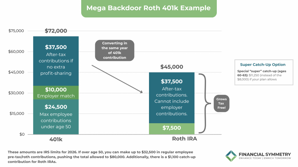 Depending on your employer’s plan provisions, the gap between your employee (pre-tax or Roth) + employer contributions and the annual maximum limit may provide room to execute the Mega Backdoor Roth strategy to increase your after-tax savings, which you can read about more here, and can find a chart explaining this strategy below.
